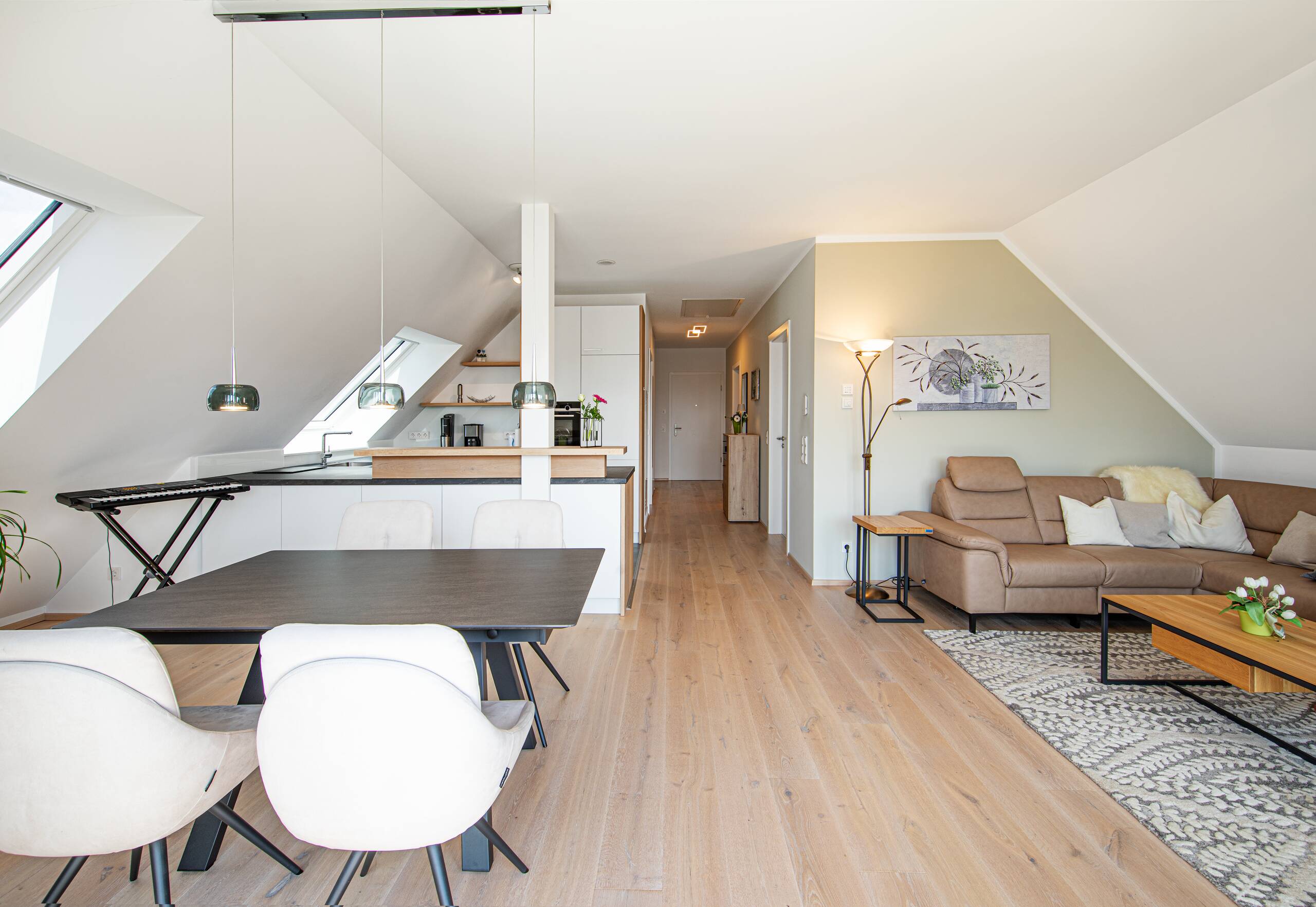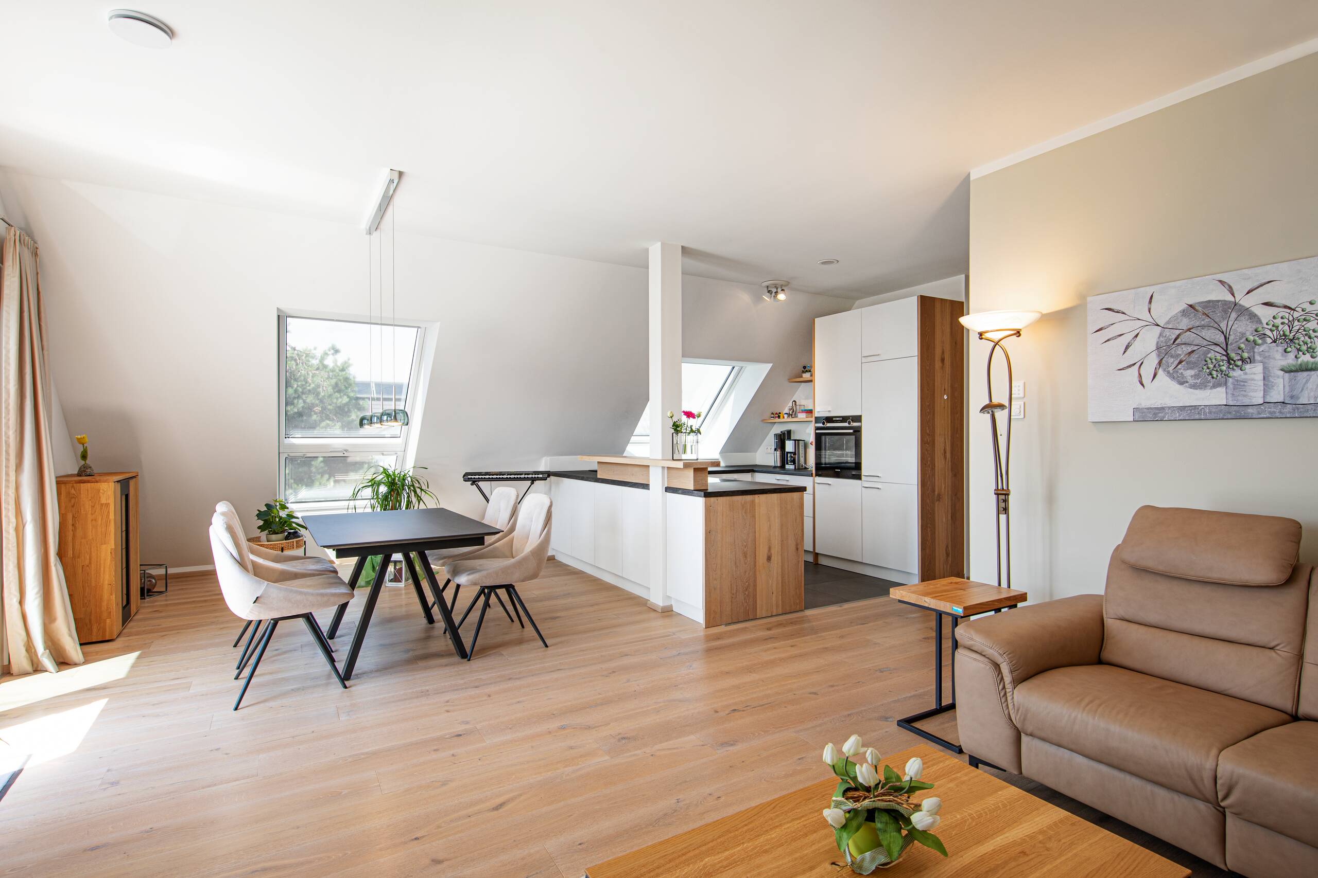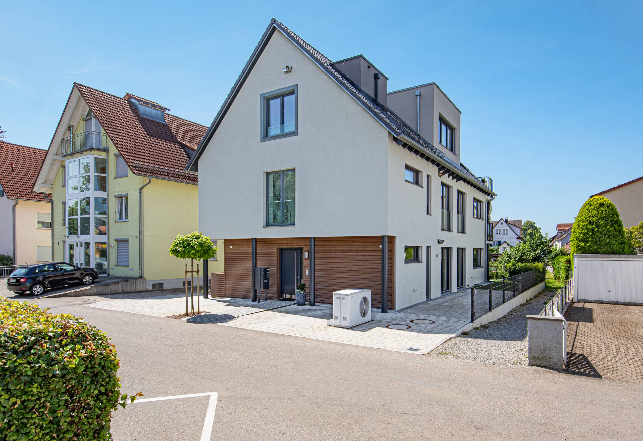 Als modernen Klassiker könnte man dieses Gebäude, welches Arbeiten und Wohnen miteinander vereint, bezeichnen: Mit der hellen Putzfassade, dem steilen Satteldach und der partiellen Holzverschalung greift es Elemente der traditionellen Architektur auf, die vorspringenden Obergeschosse und die Flachdachgauben verleihen dem Gebäude einen modernen Touch. Auf dem Dach erstreckt sich eine Photovoltaikanlage, die an einen Batteriespeicher angeschlossen ist.